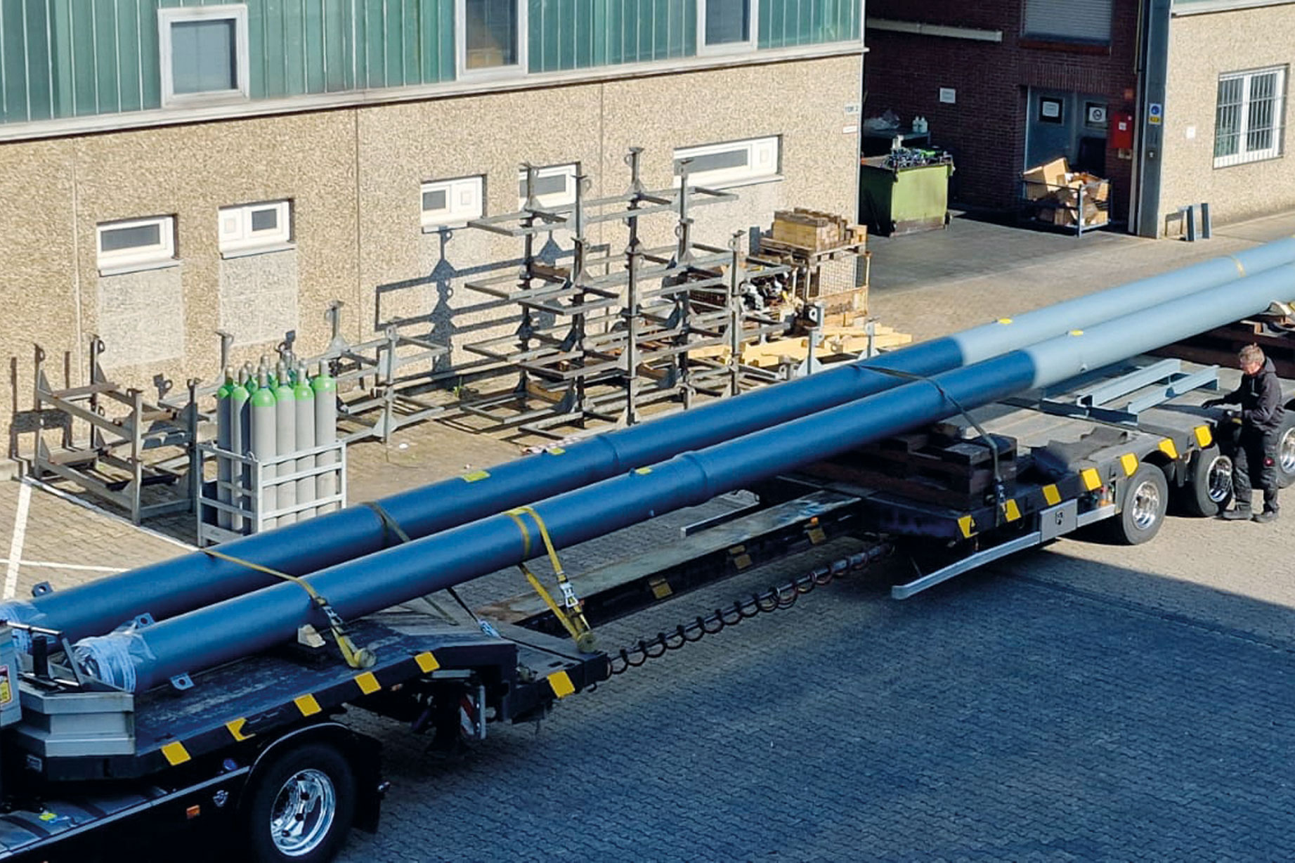 Two single-stage jacks were manufactured for an indirectly operated hydraulic elevator as part of a drive system modernization project. At a Bavarian automotive plant, vehicle parts with a maximum payload of 15,000 kg are transported 40 m by a triple-stage unit with a frequency-controlled drive from ALGI. The two jacks, with a piston diameter of 285 mm and a length of 20 m, will be lowered into the shaft by crane tomorrow morning.